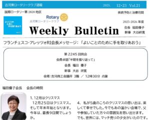 第2238回例会 週報 2025年11月2日 最終更新日時 : 2025年11月2日 admin 古河東ロータリークラブ週報 V0l.14ダウンロード \ 最新情報をチェック / FacebookXBlueskyHatenaPocketCopy