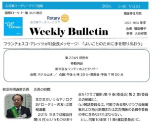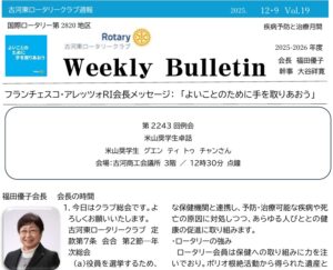 第2243回例会 週報 2025年12月6日 最終更新日時 : 2025年12月6日 admin 古河東ロータリークラブ週報 V0l.19ダウンロード \ 最新情報をチェック / FacebookXBlueskyHatenaPocketCopy