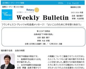 第2247回例会 週報 2025年12月27日 最終更新日時 : 2025年12月27日 admin 古河東ロータリークラブ週報 V0l.22ダウンロード \ 最新情報をチェック / FacebookXBlueskyHatenaPocketCopy