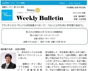 第2252回例会 週報 2026年2月7日 最終更新日時 : 2026年2月7日 admin 古河東ロータリークラブ週報 V0l.27ダウンロード \ 最新情報をチェック / FacebookXBlueskyHatenaPocketCopy