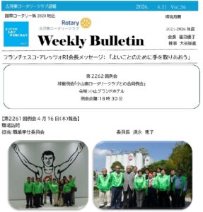 第2262回例会 週報 2026年4月19日 最終更新日時 : 2026年4月19日 admin 古河東ロータリークラブ週報 V0l.36ダウンロード \ 最新情報をチェック / FacebookXBlueskyHatenaPocketCopy